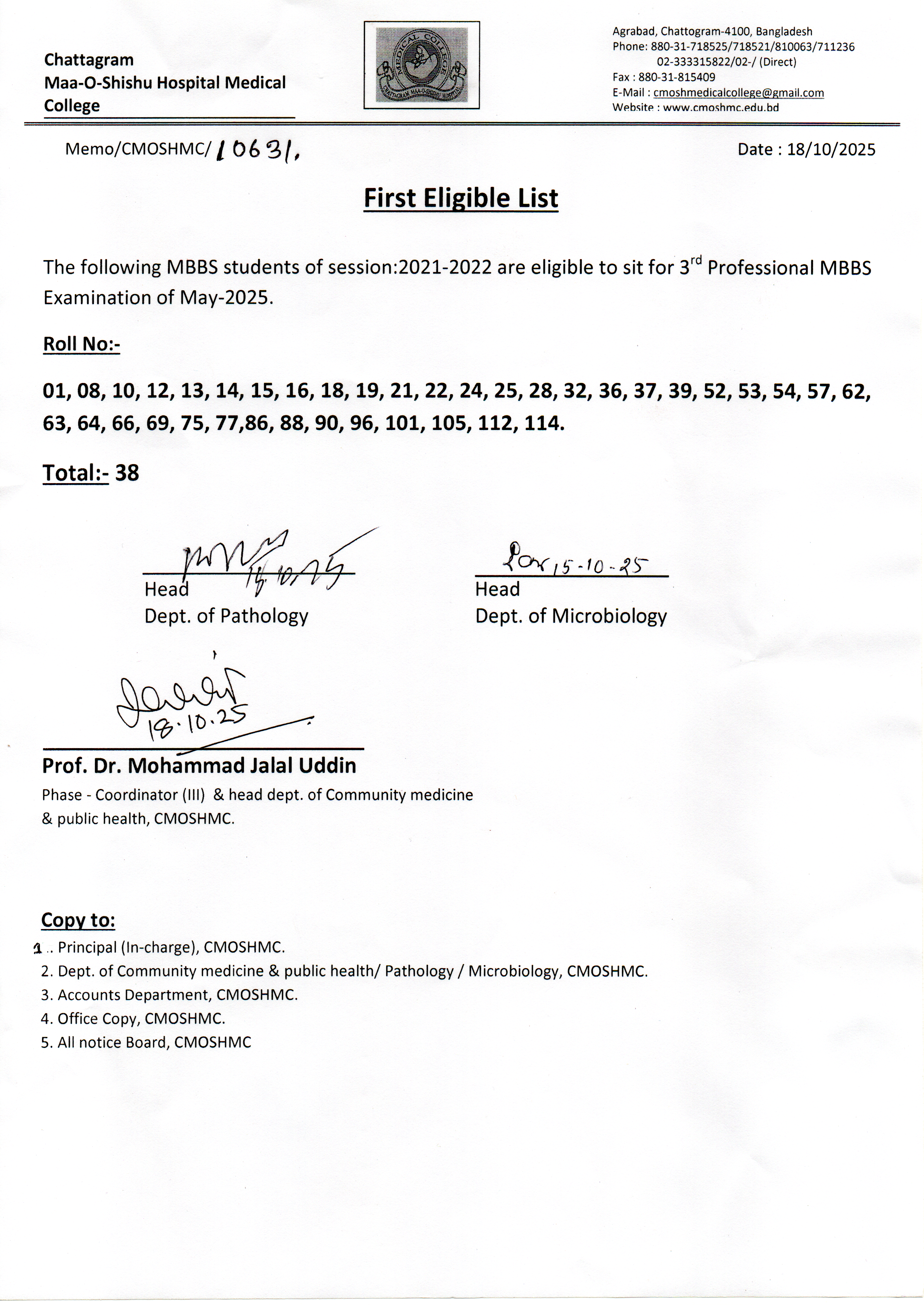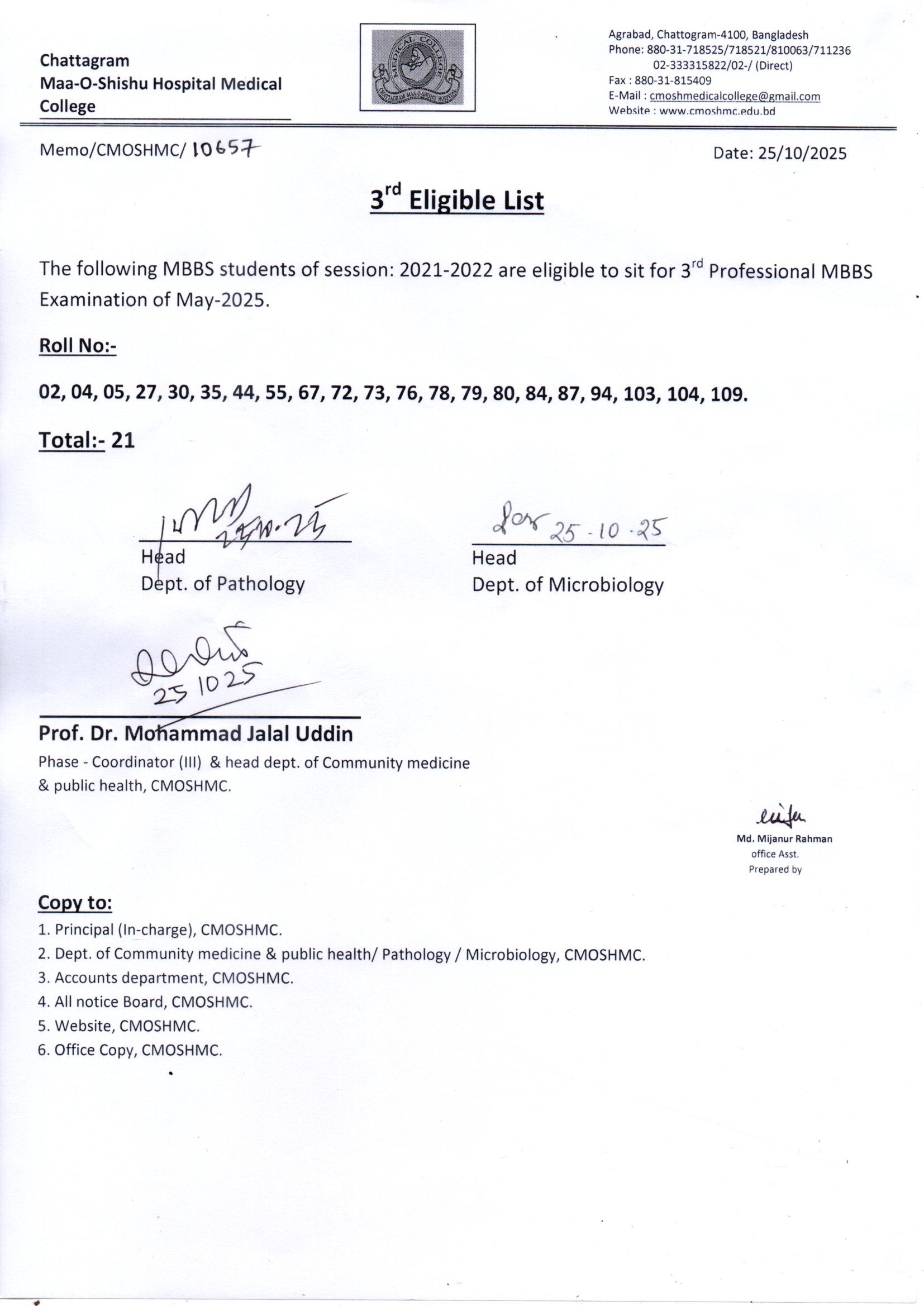 3rd Eligible List to sit for the 3rd Professional MBBS Examination of May - 2025