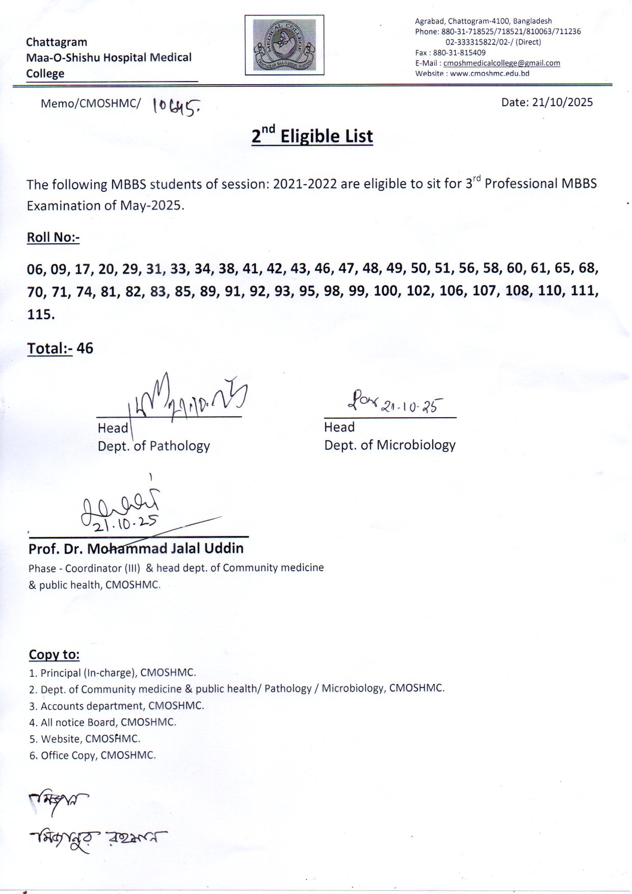 2nd Eligible List to sit for the 3rd Professional MBBS Examination of May - 2025